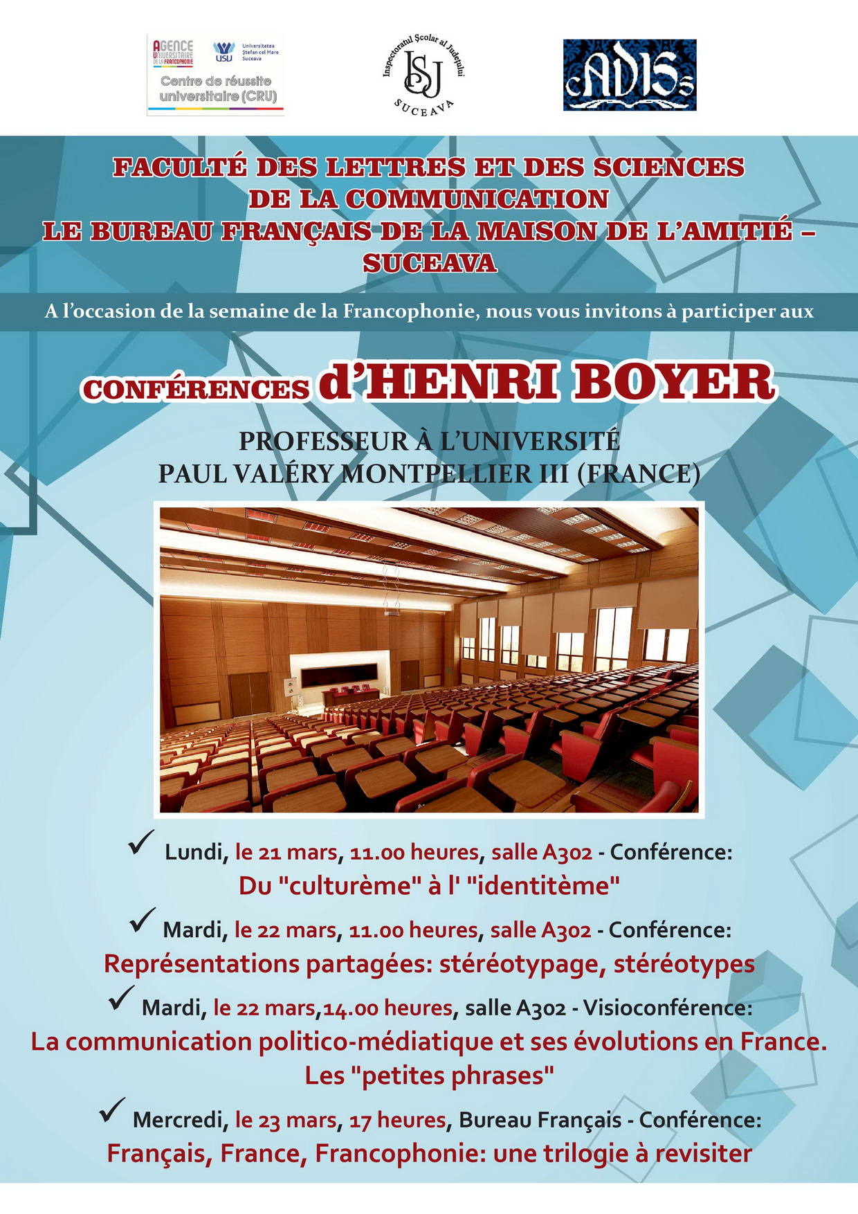 Acesta vine la Suceava, special pentru a celebra împreună Ziua Internațională a Francofoniei, la invitația doamnei prof. univ. DHC Sanda-Maria Ardeleanu, Președinta Delegației Parlamentului României la Adunarea Parlamentară a Francofoniei, iar titlul pe care ni-l propune pentru Conferința sa de la Biroul Francez este Français, France, Francophonie: une trilogie à revisiter. Conferința va fi urmată de un program artistic coordonat de doamna prof. Tamara Sabin și oferit de elevi suceveni ai Colegiului Național „Mihai Eminescu”, Școlii Gimnaziale „Miron Costin”, Colegiului Național de Informatică „Spiru Haret” și Colegiului de Artă „Ciprian Porumbescu”, ca urmare a parteneriatului pe care Biroul Francez îl are cu Inspectoratul Școlar Județean Suceava, în organizarea evenimentului.Programul domnului profesor Henri Boyer la Suceava include și o serie de conferințe pe care le va susține la Universitatea „Ștefan cel Mare” din Suceava: