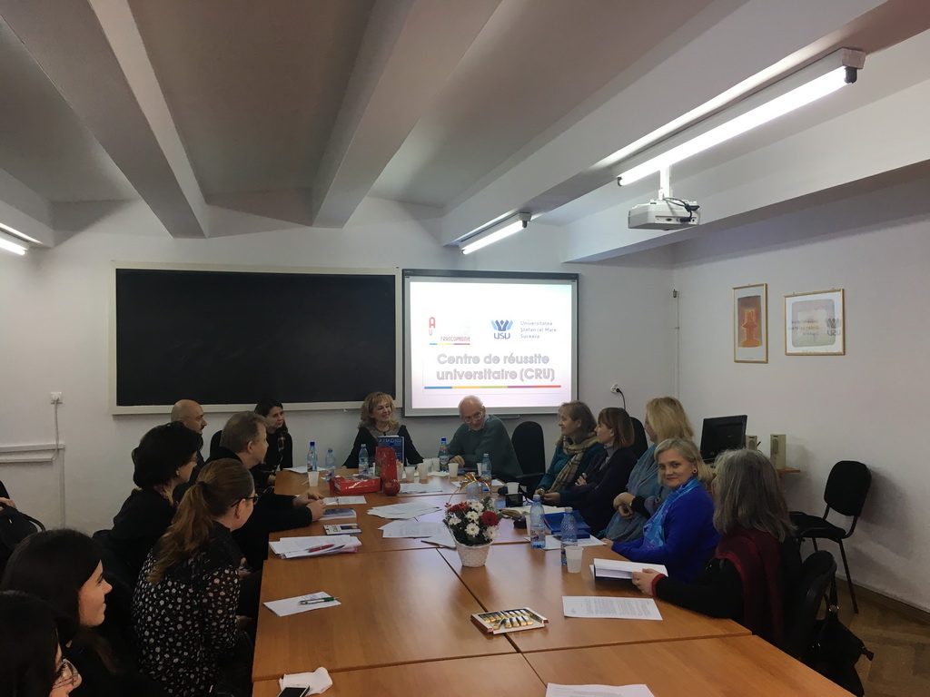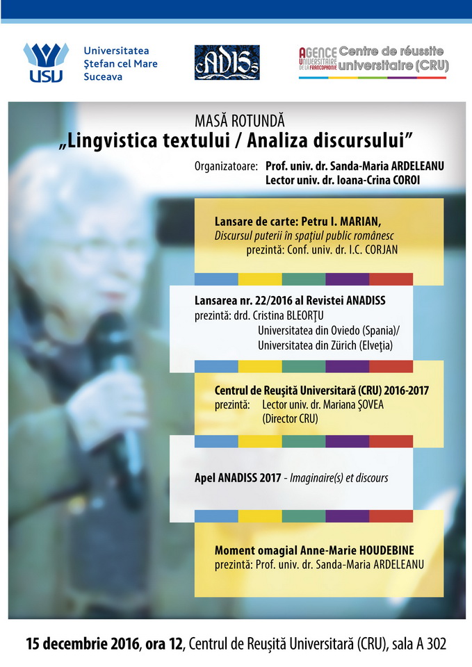 În data de 15 decembrie 2016, sala Centrului de Reușită Universitară (CRU) a găzduit Masa Rotundă cu tema «Lingvistica textului / Analiza discursului». Organizată de prof.univ.dr. Sanda-Maria Ardeleanu și lector univ.dr. Ioana-Crina Coroi, manifestarea a reunit un număr mare de profesori, doctoranzi și studenți din cadrul Universității „Ștefan cel Mare” care participă în mod activ și constant la evenimentele științifice și culturale pe care le propun atât membrii CADISS, cât și colaboratorii CRU.