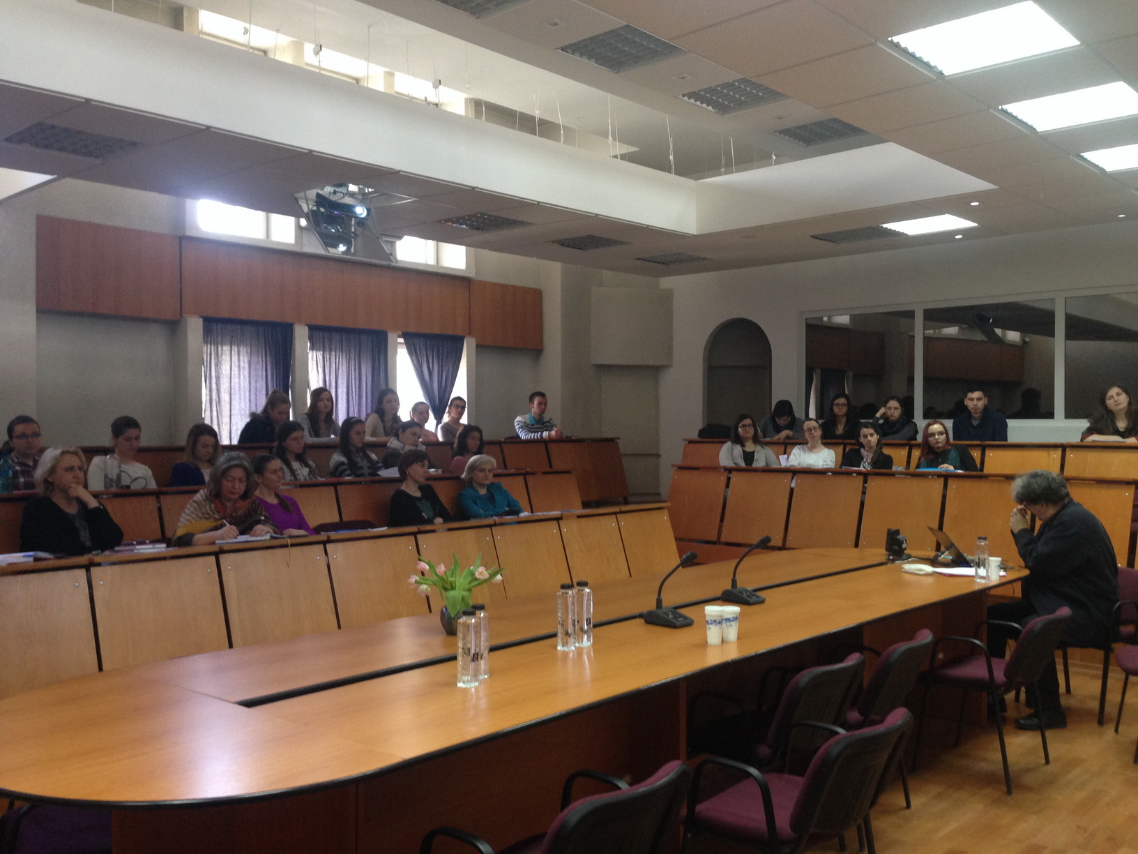 Doamna lector univ.dr. Mariana Șovea a ilustrat apoi, prin oferirea de imagini și informații punctuale, toate tipurile de activități desfășurate sub egida CRU în anul 2016 – lansări de carte, întâlniri cu studenții români și străini, conferințe cu diverse teme etc. Masa Rotundă « Lingvistica textului / Analiza discursului » s-a încheiat cu un moment extrem de emoționant pe care doamna prof.univ.dr. Sanda-Maria Ardeleanu l-a dedicat omagierii doamnei prof.univ.dr. Anne-Marie Houdebine, plecată de curând la cele veșnice. Domnia sa a vorbit cu multă dăruire sufletească despre moștenirea imensă pe care lingvista franceză a lăsat-o în toate domeniile științelor umane și sociale, punând accent pe ideile novatoare și pe cercetările remarcabile care continuă să constituie adevărate modele de investigație a problematicii Imaginarului lingvistic.